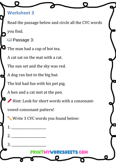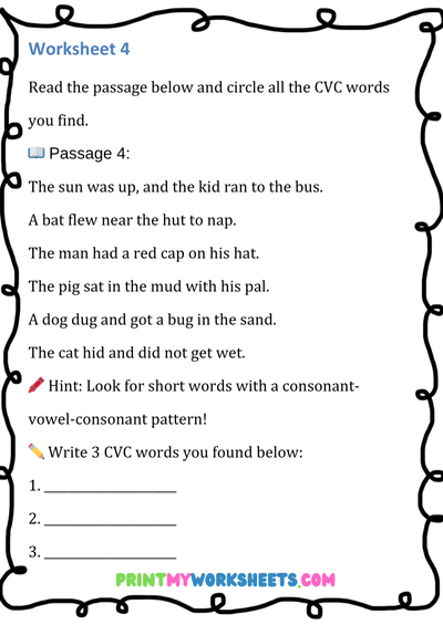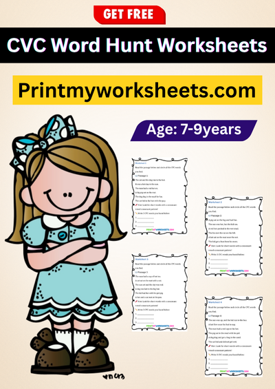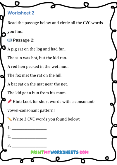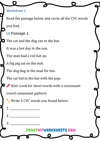 These engaging worksheets focus on CVC words (Consonant-Vowel-Consonant)—the building blocks of early reading. Children will search, identify, and write simple three-letter words such as cat, bed, pig, sun, and dog. Each page features fun word hunt activities, letter recognition tasks, and writing practice that promote phonemic awareness, spelling accuracy, and vocabulary growth.