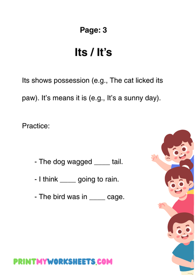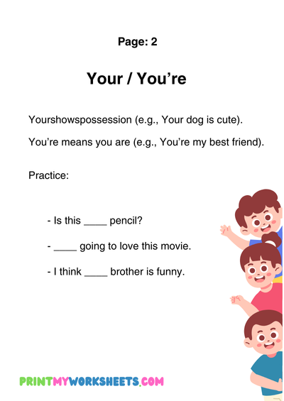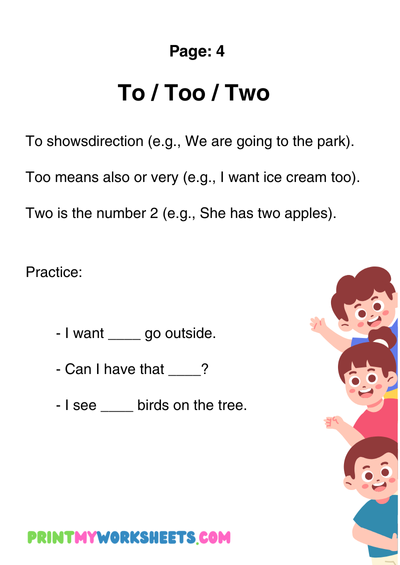 Commonly confused words—like their/there/they’re, to/too/two, or its/it’s—often create challenges for young learners. These worksheets provide clear explanations, examples, and engaging exercises to help children understand the differences and use these words correctly. Activities include fill-in-the-blank sentences, word matching, multiple-choice questions, and writing practice.