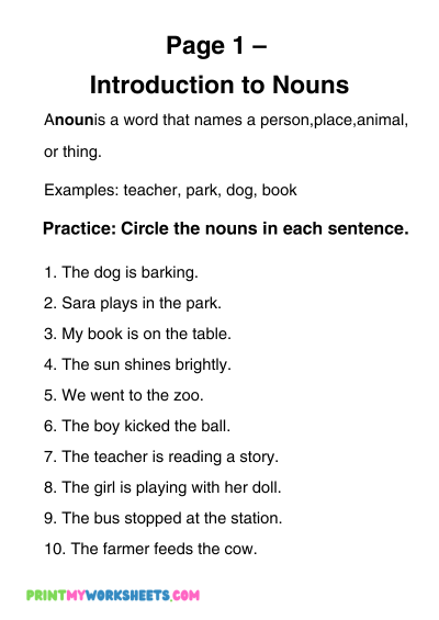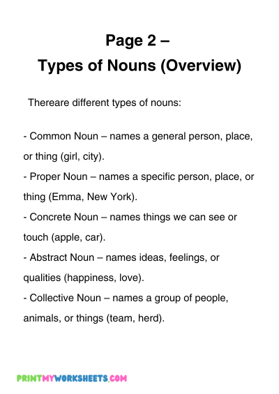 These worksheets introduce children to the concept of nouns—words that name people, places, things, and ideas—and their different types, such as common nouns, proper nouns, collective nouns, and abstract nouns. Through engaging exercises like sorting activities, fill-in-the-blank questions, word identification, and sentence writing, kids learn to recognize and correctly use nouns in everyday communication.