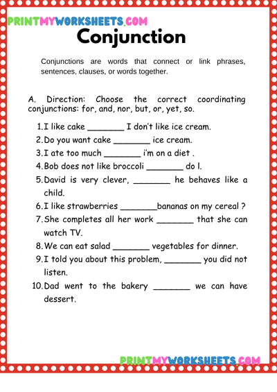 The worksheet includes fun, interactive activities such as identifying prepositions in sentences, filling in the blanks with correct conjunctions, matching exercises, and sentence writing practice. Through these tasks, children learn how prepositions show relationships between words (e.g., in, on, under, behind) and how conjunctions connect words and ideas (e.g., and, but, because). By practicing both, kids gain the ability to write clearer, more detailed sentences and improve their overall grammar fluency.