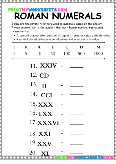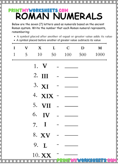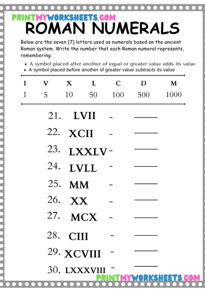 The worksheet includes Roman numerals from I to XXX, with engaging activities such as matching Roman numerals to standard numbers, tracing, fill-in-the-blank exercises, and simple puzzles. These tasks give kids hands-on practice while reinforcing number recognition, sequencing, and problem-solving skills. With clear instructions and student-friendly layouts, learning becomes interactive and fun.