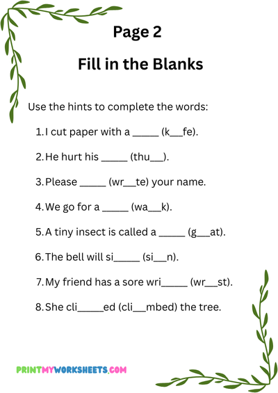 Silent letters are tricky because they appear in words but are not pronounced, such as the “k” in knight, the “b” in thumb, or the “w” in write. These worksheets introduce common silent letter patterns in an engaging, easy-to-understand way that helps children master spelling, pronunciation, and vocabulary.