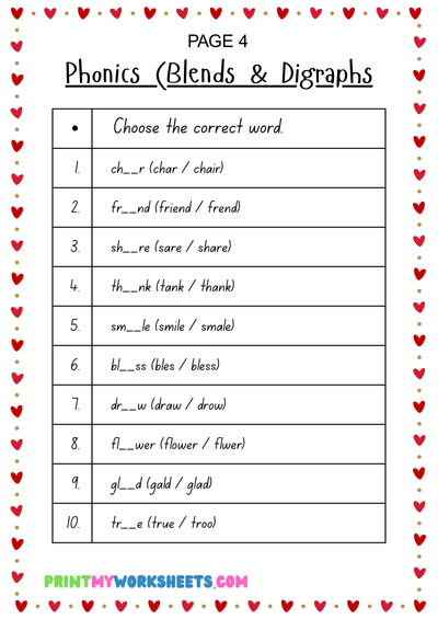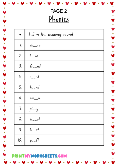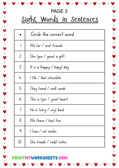 By third grade, students are expected to recognize sight words automatically and apply phonics strategies fluently when reading and writing. Valentine’s Day–themed activities help maintain interest while providing meaningful practice with commonly used words and sound patterns. These worksheets support reading fluency, spelling accuracy, and overall comprehension, making them a valuable addition to literacy lessons during the Valentine’s Day season or anytime students need extra practice.