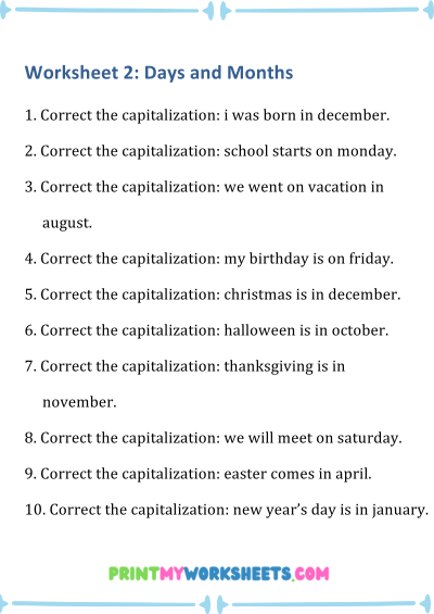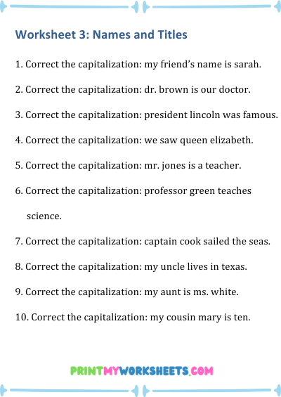 These worksheets are for US homeschool parents, teachers, and classrooms. Fun grammar activities teach capitalization of nouns, titles, months, and more. Download, print, and help kids strengthen grammar, improve writing fluency, and build confidence with interactive capitalization practice designed for elementary English learners.