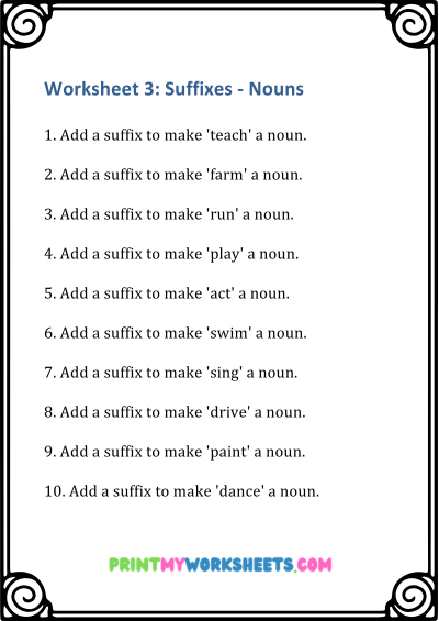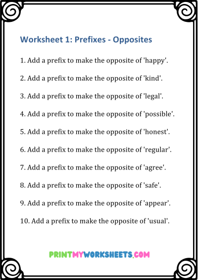 These worksheets introduce students to the power of prefixes (un-, re-, pre-, mis-) and suffixes (-ful, -less, -ness, -able, -ment). Activities include word formation, fill-in-the-blank exercises, matching roots with affixes, and sentence-writing practice. By breaking down words into parts, children learn how affixes change word meaning and usage, strengthening spelling and reading comprehension.