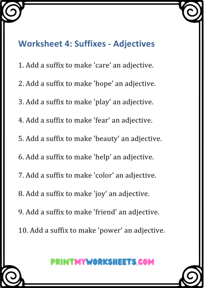 4th Grade Prefixes and Suffixes Worksheets PDF for US homeschool parents, teachers, and classrooms. Fun activities teach affixes, word formation, and meaning. Download, print, and help kids expand vocabulary, improve spelling, and strengthen comprehension skills with interactive English worksheets designed for elementary learners.