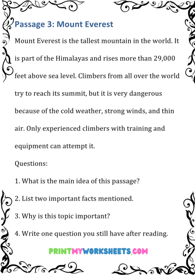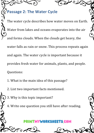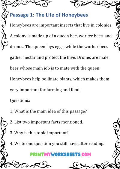 These worksheets focus on strengthening reading comprehension, vocabulary, and critical thinking. Students engage with short passages, stories, and informational texts, followed by exercises like multiple-choice questions, short answers, sequencing, and summarizing. Each activity encourages children to not only read carefully but also interpret meaning, make inferences, and analyze key details.