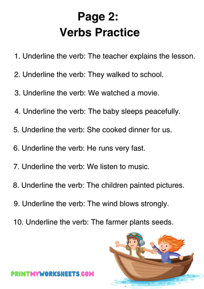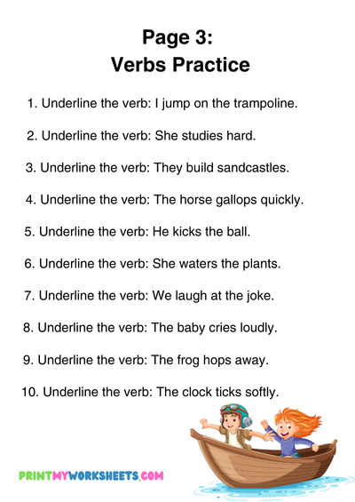 These worksheets focus on verbs, the action words that bring sentences to life. Children will practice identifying verbs, using them correctly in sentences, and understanding verb forms such as present, past, and future tense. Activities include fill-in-the-blank sentences, verb matching, sentence rewriting, and short writing prompts. Each exercise makes grammar learning interactive and fun.