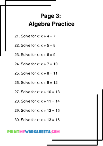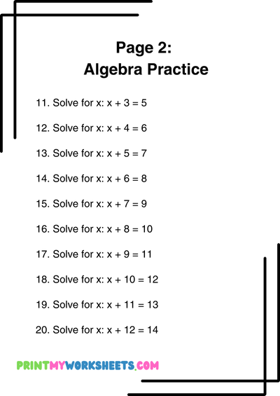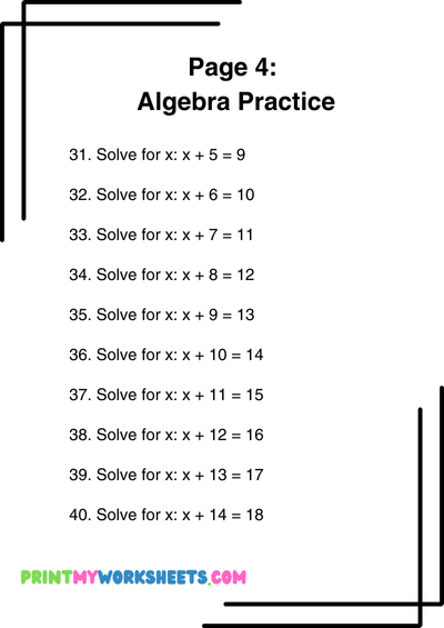 These worksheets focus on fundamental algebraic concepts such as identifying variables, solving simple equations, understanding expressions, and applying order of operations. With clear instructions and step-by-step practice, students gradually build confidence in working with algebraic problems. Activities include solving for unknowns, matching equations, simplifying expressions, and word problems that connect math to real-life scenarios.