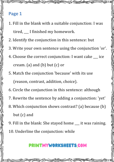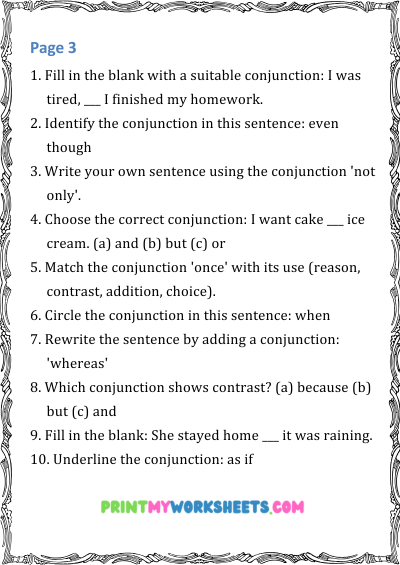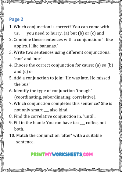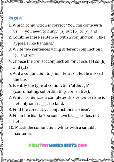 These worksheets provide targeted practice with different types of conjunctions, including coordinating, subordinating, and correlative conjunctions. Activities include fill-in-the-blank sentences, sentence combining exercises, multiple-choice questions, and writing prompts that teach kids how to connect ideas smoothly and correctly. By practicing regularly, students learn how conjunctions create logical relationships between words, phrases, and clauses, making their writing clearer and more effective.