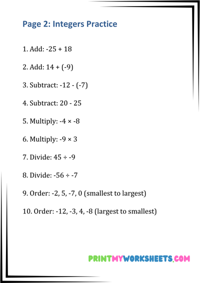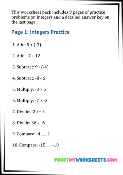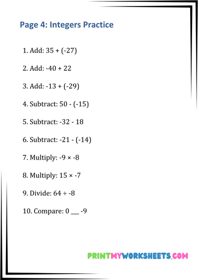 The worksheets include activities such as identifying integers, plotting integers on a number line, comparing values, and practicing addition, subtraction, multiplication, and division of integers. Real-life word problems—like temperature changes, bank transactions, and elevation differences—make the exercises meaningful and practical. With easy-to-follow instructions and structured practice, students gain the confidence they need to handle integers with accuracy.