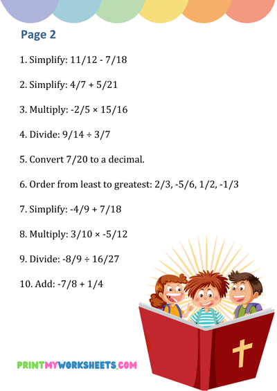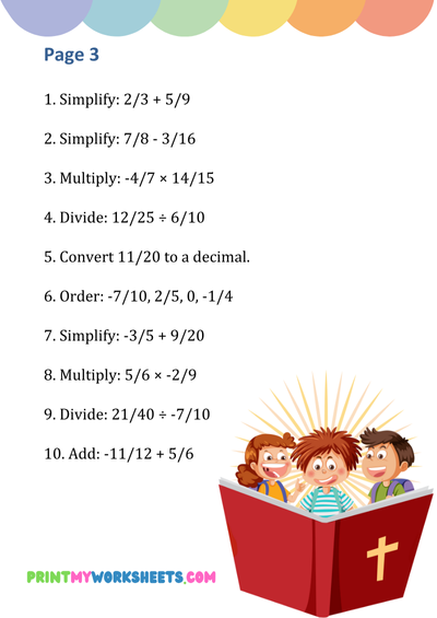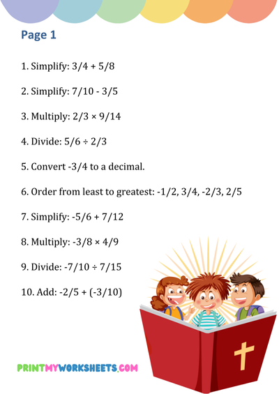 These worksheets provide comprehensive practice with rational numbers, including fractions, decimals, and integers. Students will work through exercises on addition, subtraction, multiplication, and division of rational numbers, along with comparing values, ordering numbers, and solving word problems. Each activity is presented with clear instructions, step-by-step examples, and practice problems to build confidence and accuracy.