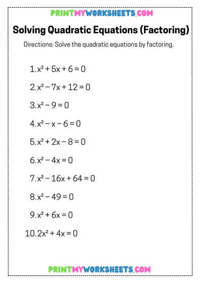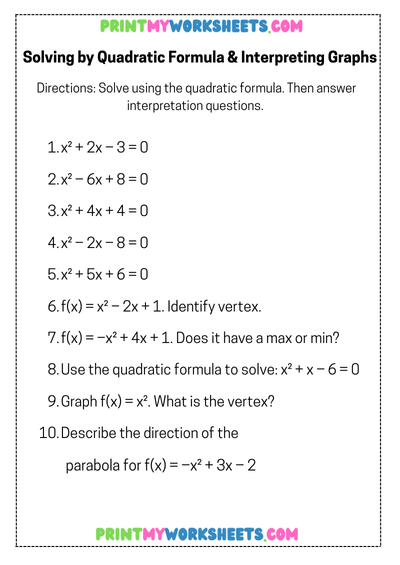 Help your 8th grader master quadratic functions with this 8th Grade Quadratic Equations Worksheets PDF! Designed to support algebra instruction, this worksheet includes factoring, graphing, and solving quadratic equations using standard methods.