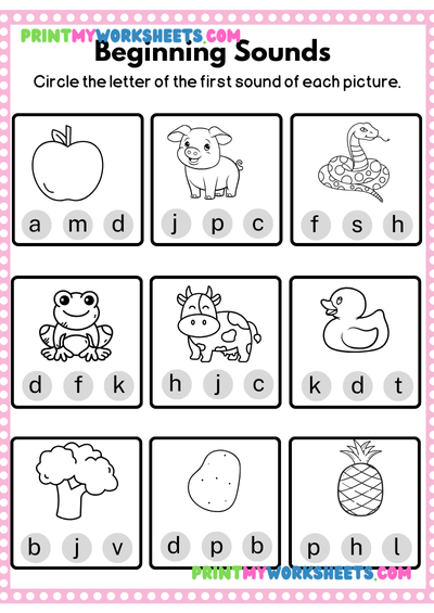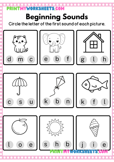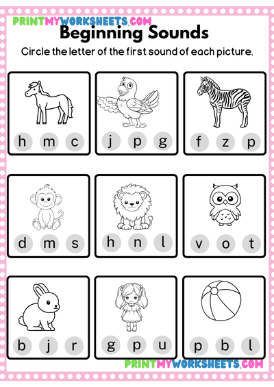 The worksheet features pictures of familiar objects alongside letters of the alphabet, encouraging kids to match each picture with its correct beginning sound. Activities like circling, coloring, and tracing make the practice interactive and fun. Through these exercises, children strengthen their phonemic awareness, letter recognition, and vocabulary while also building fine motor skills.