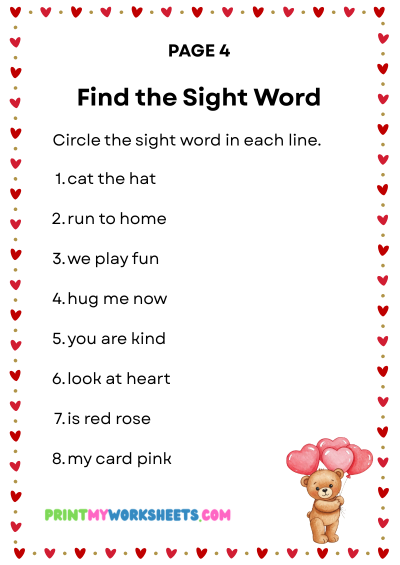 Kindergarten Valentine’s Day Sight Words Worksheets PDF